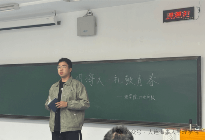 10月28日,2025 级中队在远航楼召开《文明海大,礼敬青春》中队会。辛蔚针对新生,解读文明规范,通过宣传片、行为对比图助新生理解文明内涵;制定班级文明计划,以每日内务检查、每周总结,帮新生养成文明习惯。
