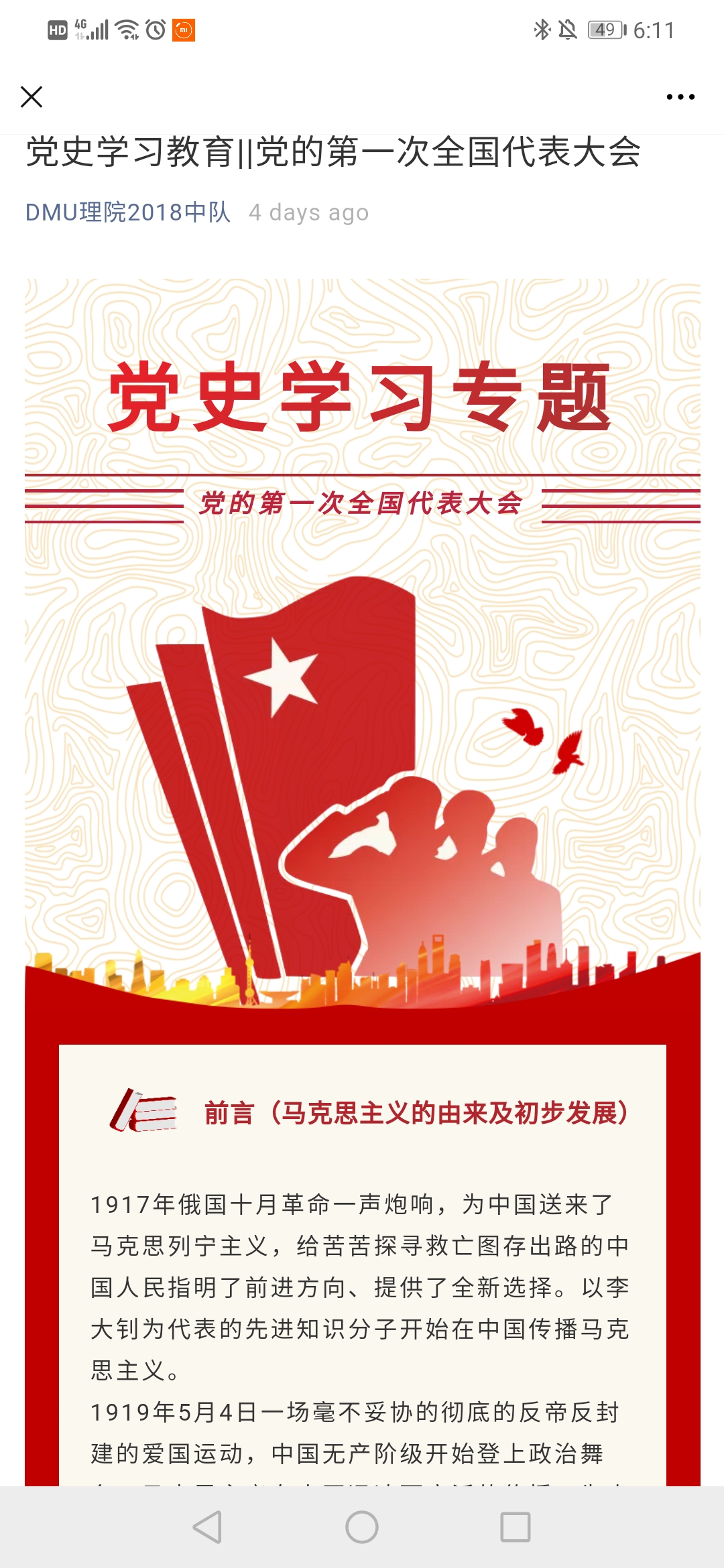 为深入学习贯彻落实习近平总书记在党史学习教育动员大会上的重要讲话精神,学党史、知党情,共筑中国梦,迎接建党100周年。理学院2018中队于2021年3月中旬开展了党的历次代表大会线上学习活动。