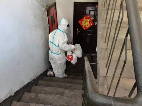 在穿上防护套装的那一刻起,面对的最大挑战就是卡车上一箱一箱的蔬菜。从早到晚,杨凯越按照规定的出发路线,在一个又一个社区中进进出出,有的楼有电梯,但更多地是七层老楼,志愿者们只能扛着箱子,踩着又高又陡的台阶,一层又一层地配送。冬天很冷,但防护服里面的衣服已经完全湿透,脸上的汗水蒸发后又在护目镜上凝成白雾。12个小时下来,胳膊甚至已经失去了平举的力量。但是当敲开每家每户的门,看到他们眼中的喜悦,杨凯越觉得无论承受怎么的寒冷,忍受怎么样的劳累都是值得的。