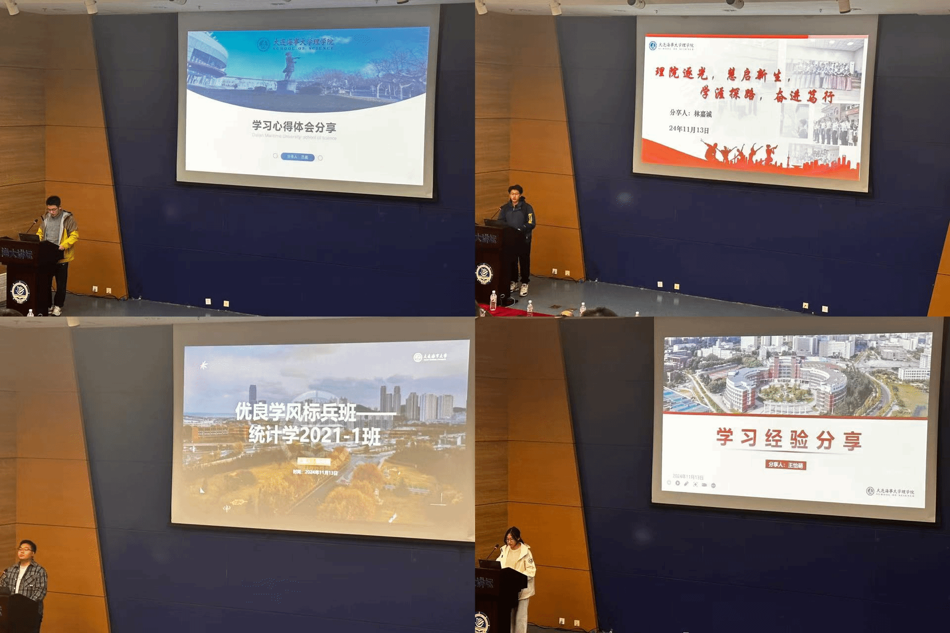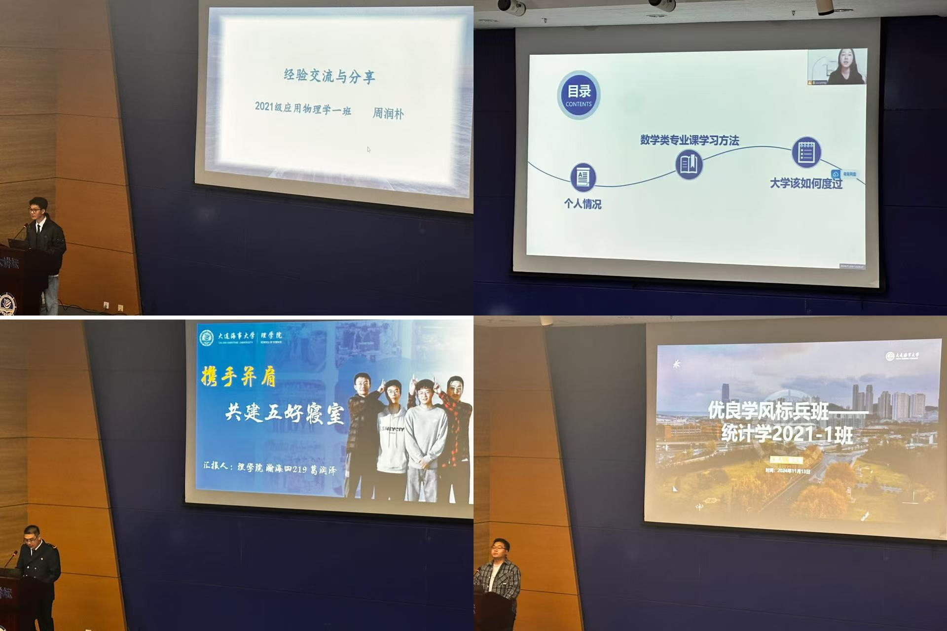 在事迹汇报和经验分享环节,十佳大学生,2021级应用物理学专业周润朴分享了自己从压线入学到努力提升成绩、参与科研竞赛并收获成果的奋斗经历。小米特等奖学金获得者,2021级数学与应用数学专业蔡伊婷则通过自己的学习经历,向同学们传授了高效学习的方法和技巧。十佳优良学风标兵寝室代表,2021级应用物理学专业葛润泽分享了寝室成员如何相互激励、共同进步的故事。2021级统计学专业张天赐作优良学风标兵班经验分享、2022级数学与应用数学专业王怡萌、应用物理学专业范晨以及2023级统计学专业林嘉诚也分别就自己的学习经验、科研心得和成长故事进行了介绍。