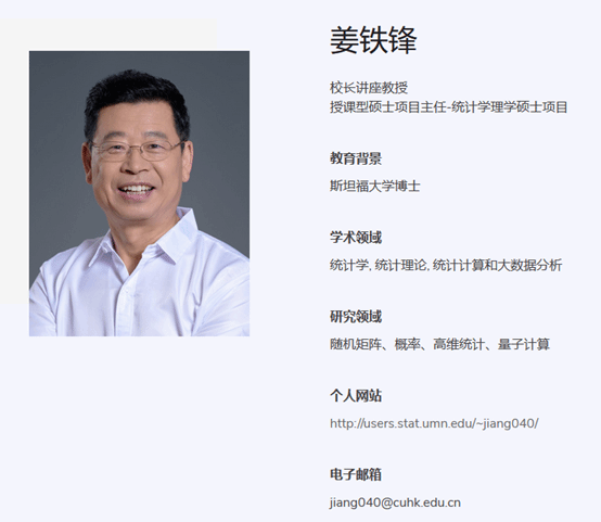 个人简介:姜铁锋,美国斯坦福大学博士毕业,美国明尼苏达大学统计系终身教授,美国NSF Career Award获得者,现为香港中文大学深圳分校数据科学学院教授。主要从事概率统计及其相关领域的研究工作,特别是在概率论、高维统计以及纯数学等交叉学科取得了突破性的进展。姜教授解决的“哈尔西矩阵被独立随机变量逼近”的结果被用于量子计算的研究中。姜教授目前已发表论文50多篇,其中绝大部分发表在国际顶尖的概率统计与机器学习杂志上,包括《Ann. Probab.》、《Probab. Theor. Rel. Fields》、《Ann. Stat.》、《Ann. Appl. Probab.》、《J. Mach. Learn Res.》、《J. Number Theory》及《Transactions of American Mathematical Society》等。